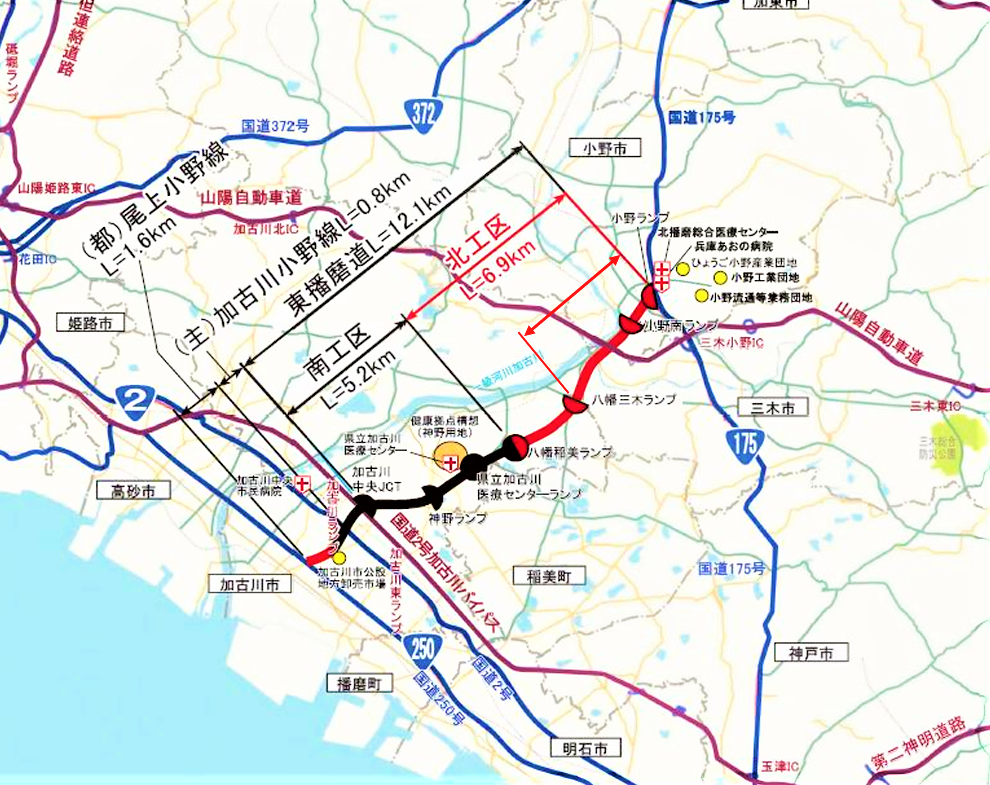 国道2号(加古川中央ジャンクション)から国道175号(小野ランプ)まで約12㎞が自動車専用道路で結ばれます。
